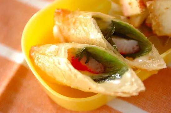 春巻きの皮にスライスチーズ、大葉、カニ風味カマボコの順にのせ、春巻きの要領で巻く。巻き終わりを混ぜ合わせた<小麦粉のり>で留める。