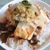 (1)を高く盛り、<合わせダレ>を回しかける。お好みでラー油をかける。