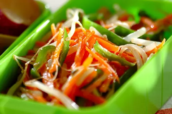 モヤシは洗って水をきる。ニンジンは皮をむき、スライサーで細切りにする。ピーマンは縦半分に切ってヘタとタネを取り除き、縦に細切りにする。