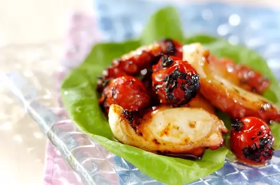 温めた焼き網にゆでタコ足、プチトマトをのせ、全体に焼き色がつくまで焼き、<マリネ液>に漬ける。