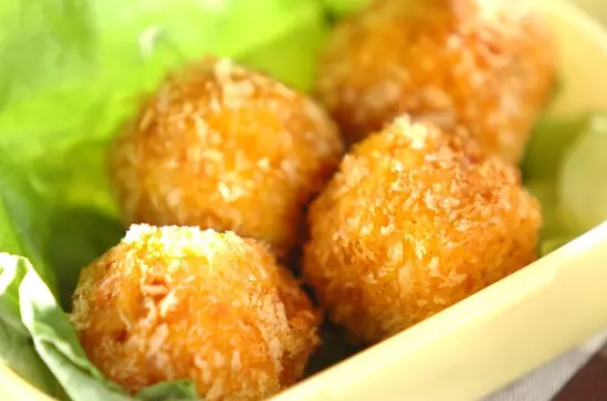 カボチャに玉ネギ、ベーコン、ピザ用チーズを加えて混ぜ合わせ、塩コショウで味を調える。小さめのひとくち大に形を整え、小麦粉、溶き卵、パン粉の順に<衣>をつける。