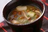 ナメコを加え、再び煮立つ直前に火を止め、刻みネギを加え器に注ぎ入れる。