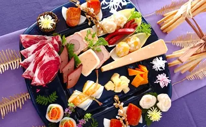 その他、○ 市販のオードブル(サーモンテリーヌ,フォアグラテリーヌ,スモークレバー)○きぬた巻き(サーモンのきぬた,糸ヨリきぬた)○グリッシーニ,生ハム,ハードチーズ類○近江コンニャク:近江コンニャクを細切りにてオリーブ油を熱したフライパンで炒めて塩コショウで味を調える。○ユリネのシロップ漬け○揚げ稲穂,扇素麺,松葉,花つづみ,開花宣言,昆布カゴ
