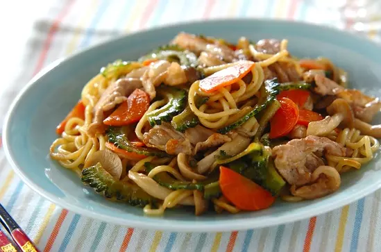 薄切りにしたゴーヤをそのまま豚肉と炒めた、ゴーヤの苦みを味わう焼きそばです。